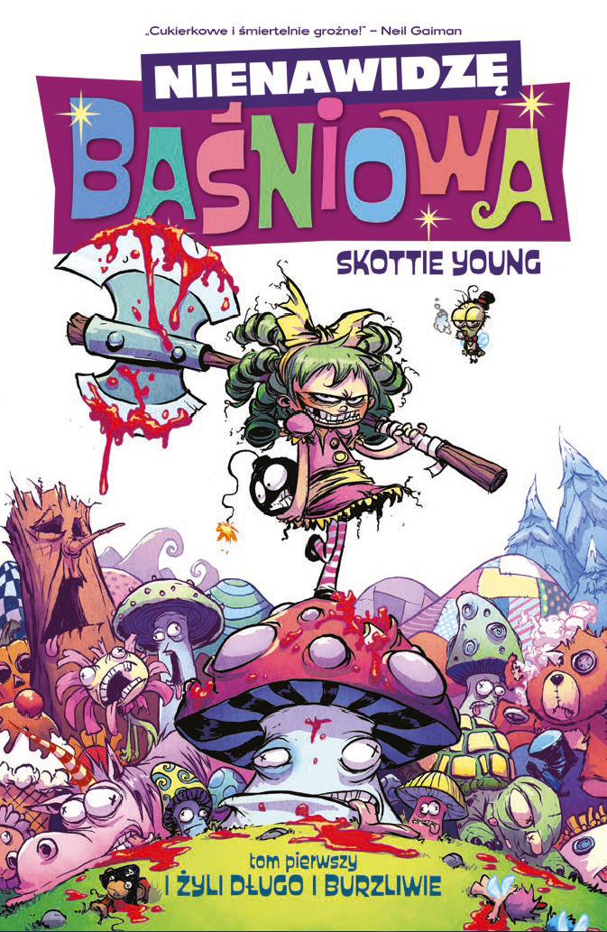 Hejho, jeżeli jesteście względnie normalni i czujecie, że nie jesteście gotowi na tego typu humor, to „Nienawidzę Baśniowa” może być dla Was nie tylko za mocne, ale wręcz nieśmieszne. Jeśli za to jesteście tak starzy, że pamiętacie jeszcze wesoło tryskające fontanny krwi z „Happy Tree Friends”, to sprawdźcie przykładowe plansze z komiksu Younga. Będzie to ostateczny test przed krwawą, pozbawioną jakiejkolwiek cenzury wyprawą z zielonowłosą Gertrude.