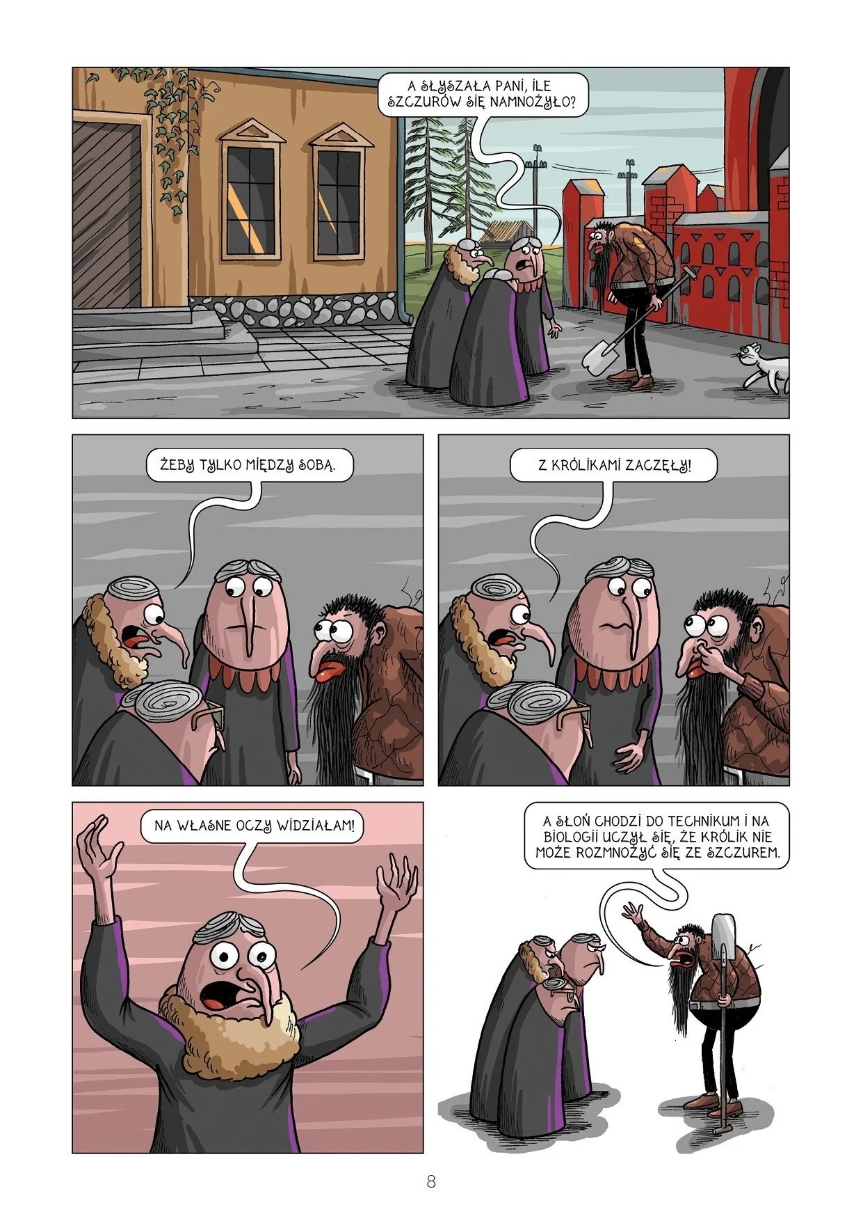 Tym razem jako wątek otwarcia posłużyły zawarte w tytule tego tomiku szczuróliki. Niby nic szczególnie dla tej serii nowego, bo od quasi-baśniowych stworów od zawsze było w niej rojno. Polimorfizm bytów na wzór światów kreowanych z pograniczy jawy i snu to zresztą jedna z najmocniejszych stron przedsięwzięcia Śmiechosława. Stąd skoro na nikim nie robi wrażenia kaczka w szkolnej ławie, tudzież hasające w przestrzeni pól uprawnych diabliki, toteż również szczurokróliki płynnie wkomponowują się w świadomość społeczności, której częścią jest Grabarz Józef. A czy faktycznie istnieją, czy też są kryptydą pokroju chupacabry i rogawca roztoczańskiego, to już zupełnie inna kwestia.