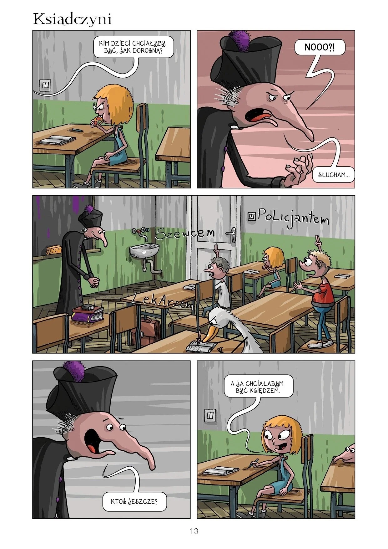 To zresztą nie jedyna z zebranych tu opowieści w której znacząca rola przypadła Marcjannie, bystremu dziewczątku o nad wyraz niekonwencjonalnych planach zawodowych. Zresztą już tylko po ilustracji zdobiącej okładkę „Sekretu…” znać, że to właśnie ona okaże się współbohaterką tego albumiku. Nie pierwszy już zresztą raz, choć tym razem w jeszcze większym natężeniu. Okazało się to dobrą decyzją, bo młodzieńcza ciekawość rzeczonej stała się kanwą dla historyjek w których Marcjanna doskonale odnalazła się bez wsparcia Józefa.