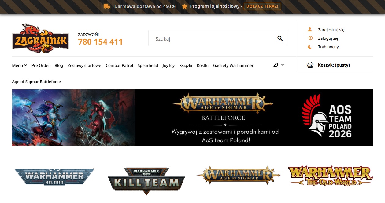 Sklep internetowy z figurkami Warhammer Zagrajnik zaczynał jako mały punkt w Izabelinie pod Warszawą. Dzisiaj to jedno z najszybciej rozwijających się miejsc na warhammerowej mapie Polski. Witryna internetowa sklepu jest lekka, przejrzysta i czytelna. Bez trudu da się znaleźć wszystkie potrzebne produkty, a także informacje o promocjach i wydarzeniach.