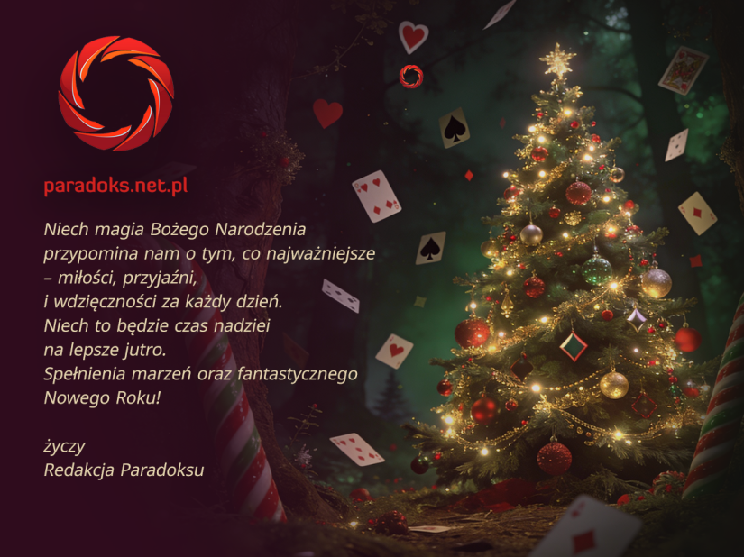Drodzy Czytelnicy i Sympatycy! Z okazji Bożego Narodzenia redakcja portalu Paradoks składa Wam najserdeczniejsze życzenia radosnych, pogodnych świąt spędzonych w rodzinnej atmosferze z dala od codziennych trosk i zmartwień. Niech ten wyjątkowy czas upłynie Wam pod znakiem miłości i odpoczynku, dostarczy wiele przyjemności, wytchnienia, wymarzonych prezentów pod pachnącą choinką i spełnionych marzeń, a pomyślność niech Was nie opuszcza w nadchodzącym roku. Wesołych Świąt!