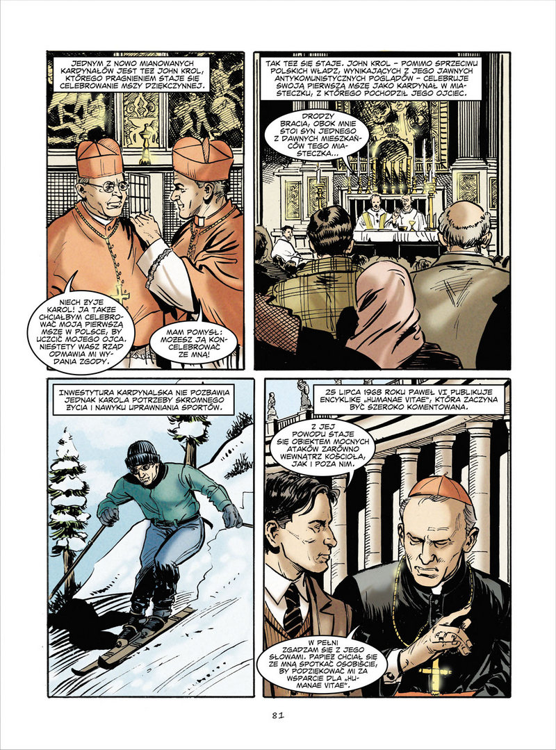 Podobnie jak w przypadku wcześniejszych tego typu przedsięwzięć (vide m.in. „Z Wadowic do Rzymu. Dzieje życia Karola Wojtyły-Jana Pawła II” oraz w swoim czasie bezkonkurencyjny bestseller Marvela „The Life of Pope John Paul II”) także niniejsza inicjatywa twórcza to kompleksowa prezentacja losów tytułowego protagonisty. Wczesne lata spędzone w rodzinnych Wadowicach (notabene naznaczone przedwczesnym śmiercią zarówno jego matki, jak i starszego brata), fascynacja aktorstwem, a w jeszcze większym stopniu katolicką duchowością, koszmar niemieckiej okupacji, aktywność duszpasterska na kolejnych szczeblach kapłańskiej hierarchii oraz konfrontowanie się z komunistycznym totalitaryzmem to tylko kilka z licznych wątków, które złożyły się na obszerne preludium do przybliżenia dziejowej roli Karola Wojtyły. Bowiem 16 października 1978 r. upomniała się o rzeczonego Wielka Historia. Nieprzypadkowo zatem na kolejnych stronicach przybliżono przebieg epokowego pontyfikatu Jana Pawła II, aż do pamiętnego „Roku Dwóch Wielkanocy”, tj. 2005, kiedy to bohater tego obszernego albumu zakończył swoją życiową drogę.